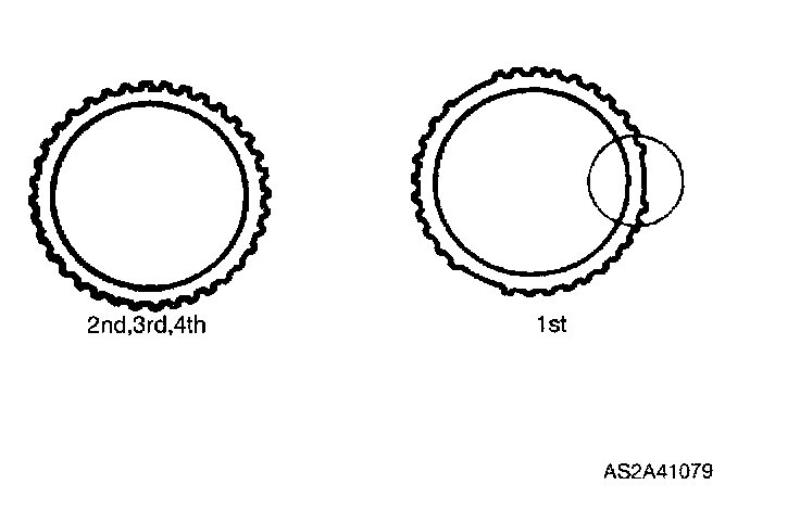 Notice: The 1st synchronizer ring has teeth missing at three places around its outer edge to help distinguish it from other synchronizer rings.