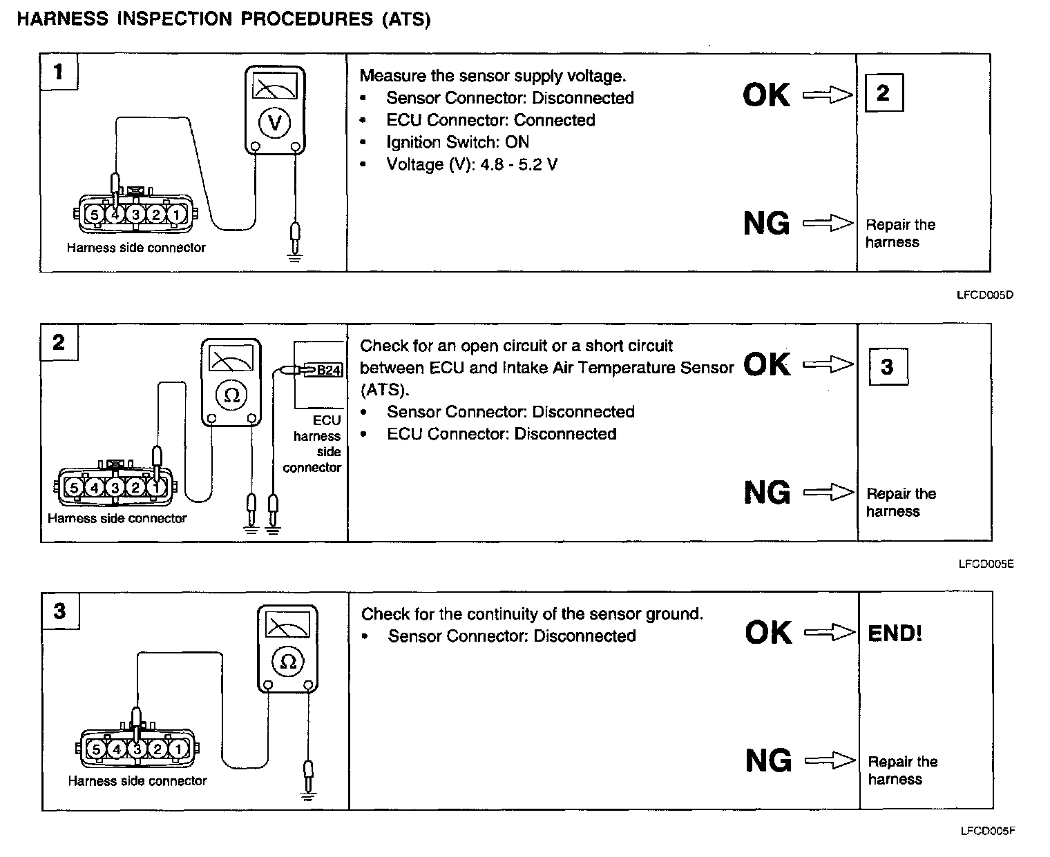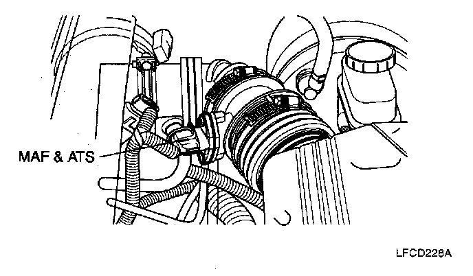 AIR FLOW SENSOR (AFS): MASS AIR FLOW (MAF) SENSOR & INTAKE AIR TEMPERATURE SENSOR (ATS)This hot film type Air Flow Sensor (AFS) is composed of a hot film sensor, housing and metering duct (hybrid sensor element). Mass air flow rate is measured because the change of the mass air flow rate causes a change in the amount of heat being transferred from the hot film probe surface to the air flow The air flow sensor generates a pulse so it repeatedly opens and closes between the 5 V voltage supplied from the ECU.