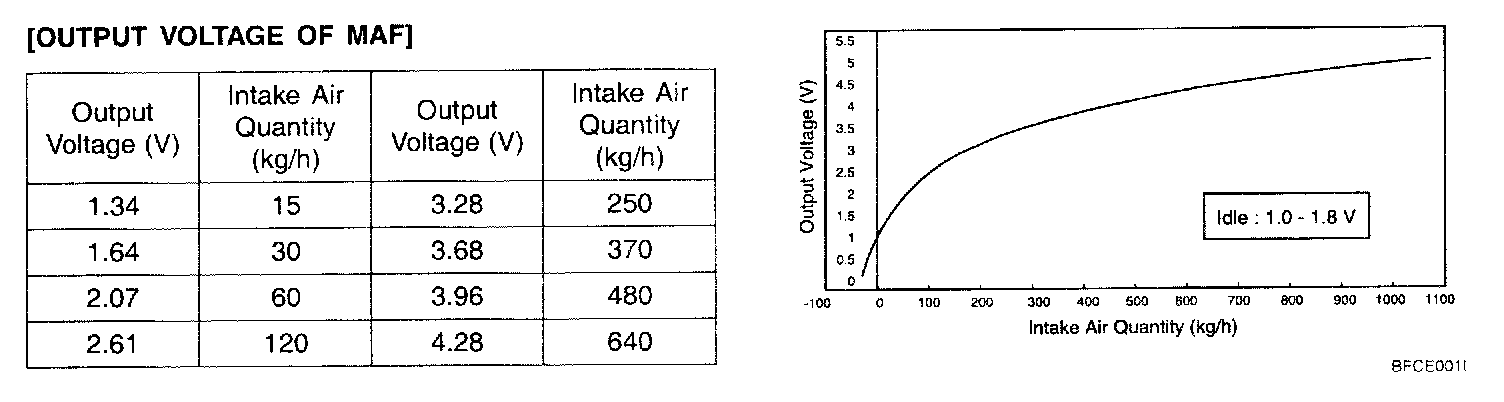 3. If the engine can idle even if the MAF sensor output voltage is out of specification, check for the following conditions;