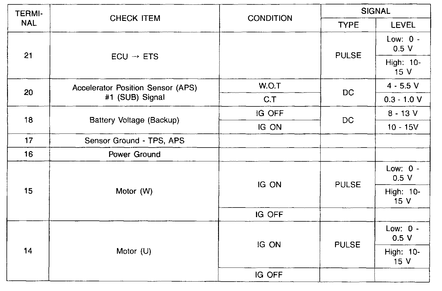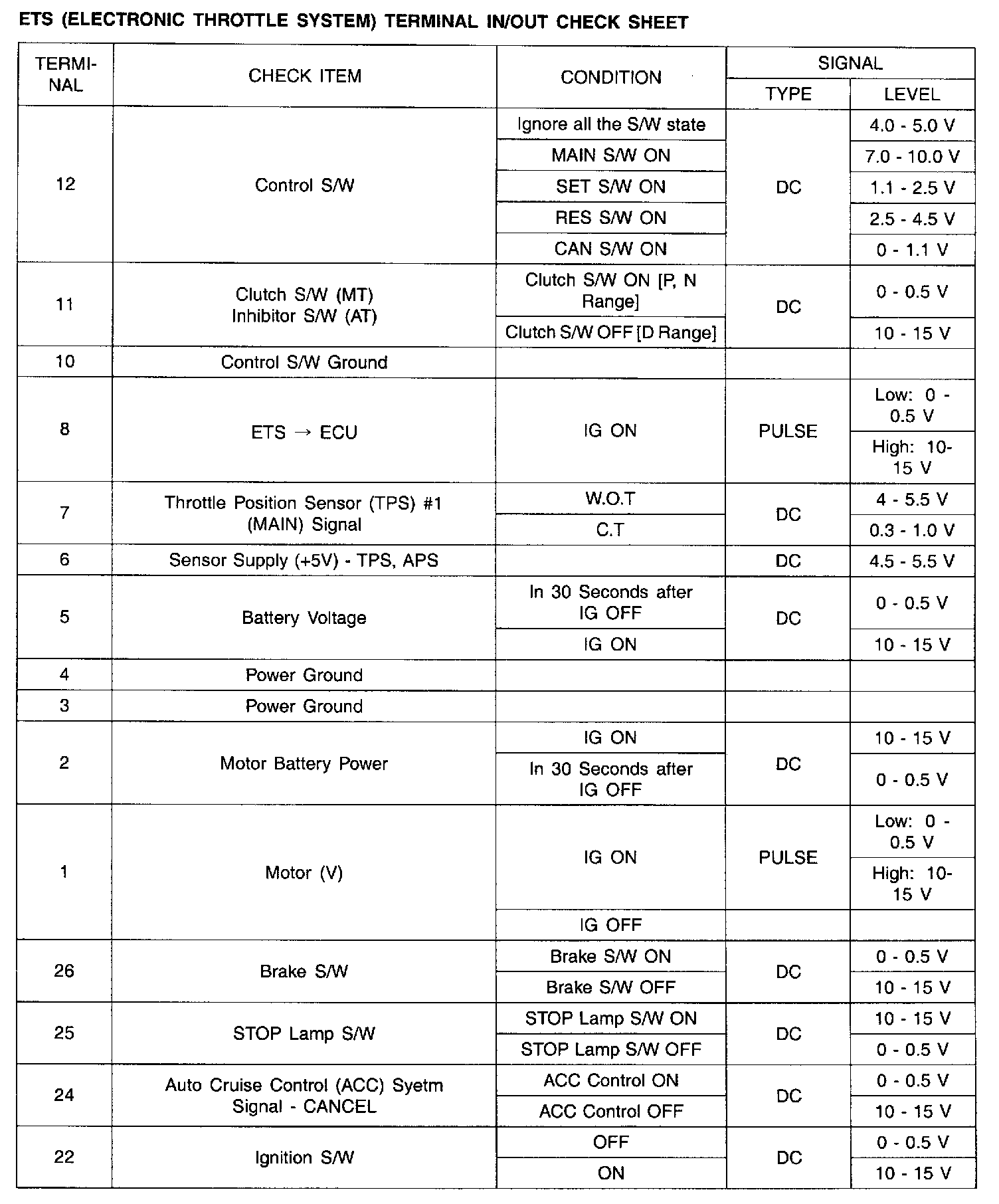 ETS (Electronic Throttle System) Terminal In/Out Check Sheet
