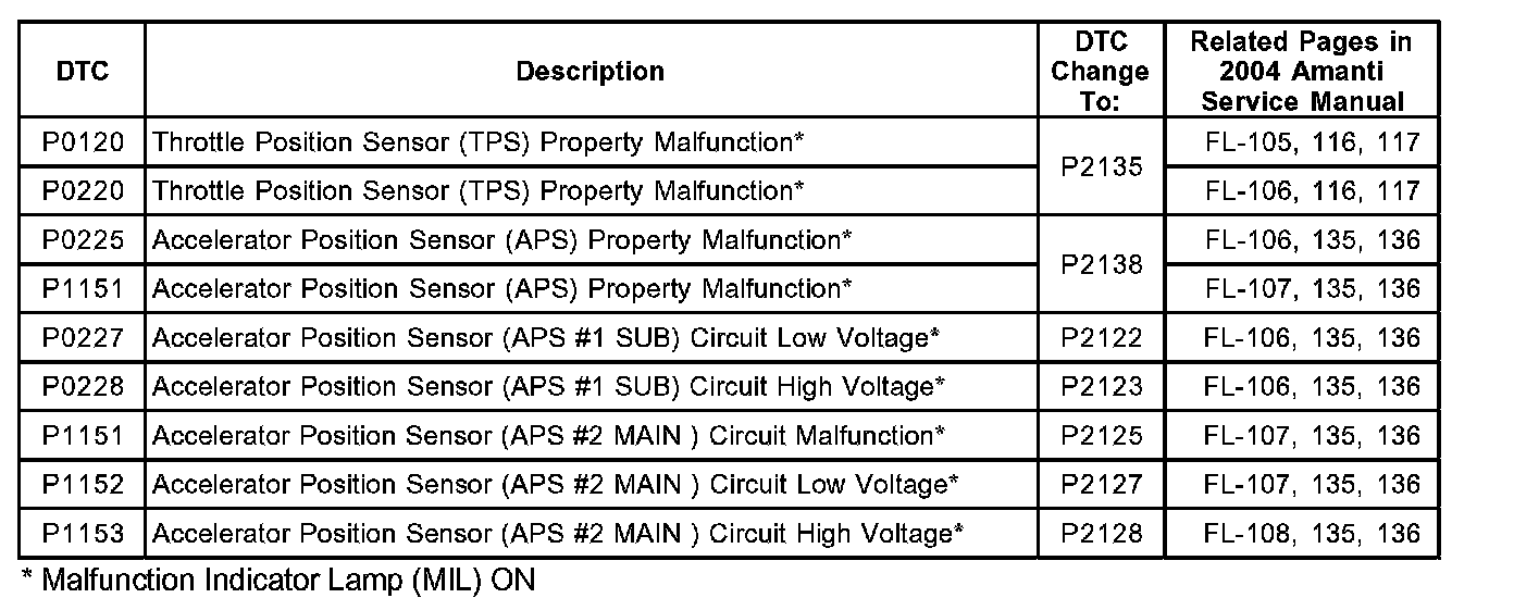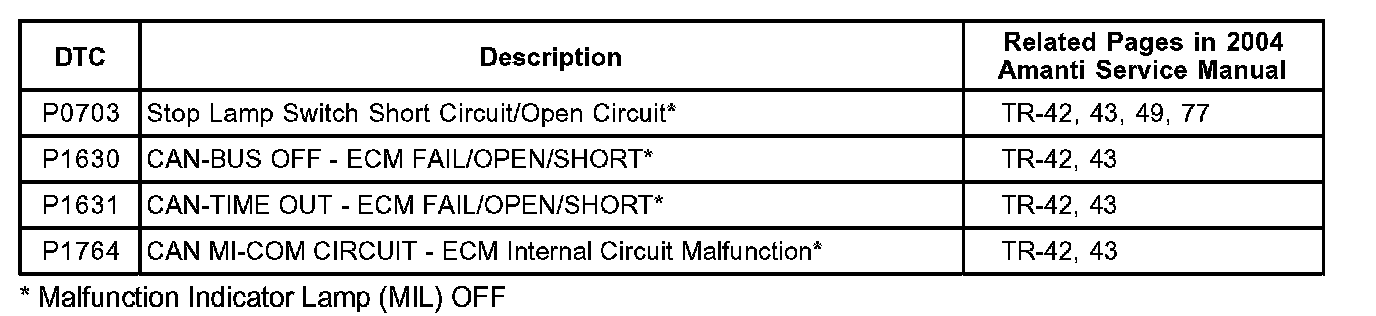 This bulletin provides information related to changes in the Diagnostic Trouble Codes (DTCs) shown in the 2OO4MYAmanti Service Manual PIN UHO4O P5010. Refer to the list of new DTCs when servicing 2OO4MYAmanti. Note: All information on this TSB has been corrected on KSIS.