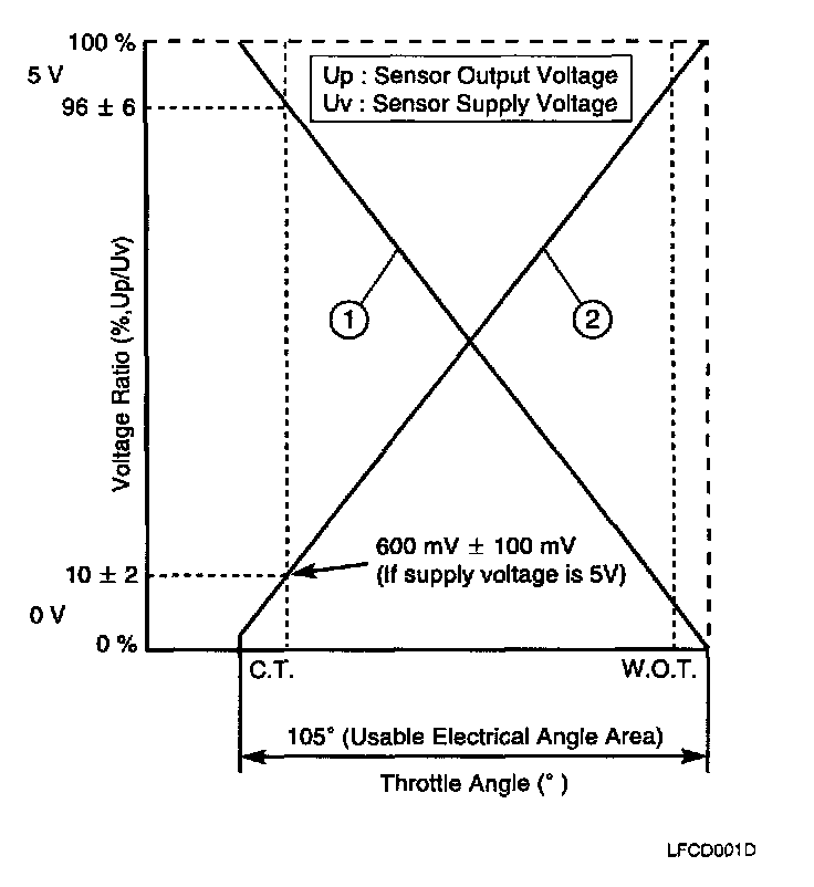 4. Inspect the sensor signal with rotating the throttle valve from C.T. to W.O.T., at this time the sensor signal varies proportional to throttle angle.
