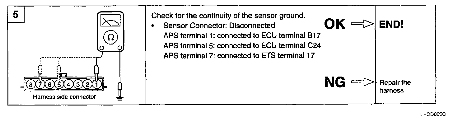 5. Replace the APS if the sensor signal is out of range and is not directly proportional to the accelerator pedal angle.