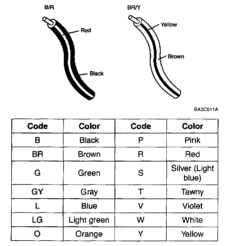 Two-color wires are indicated by a two-color code symbol. The first color indicates the base color of the wire; the second color indicates the color of the stripe.