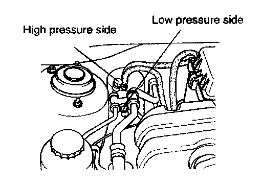2. Connect a R-134a refrigerant Recovery/Recycling/Charging System to the high-pressure service port and the low-pressure service port as shown, following the equipment manufacturer's instructions.