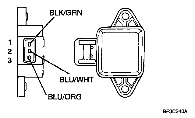 3. Connect voltmeter between terminals 1 (BLK/GRN wire) and 3 (BLU/ORG wire) on throttle position sensor connector.