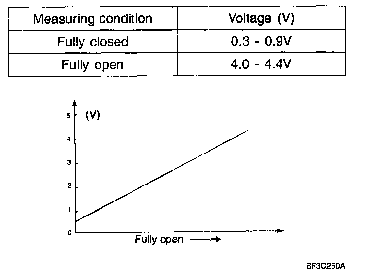 5. Fully open throttle valve and verify that voltage at terminal 3 is within specification.
