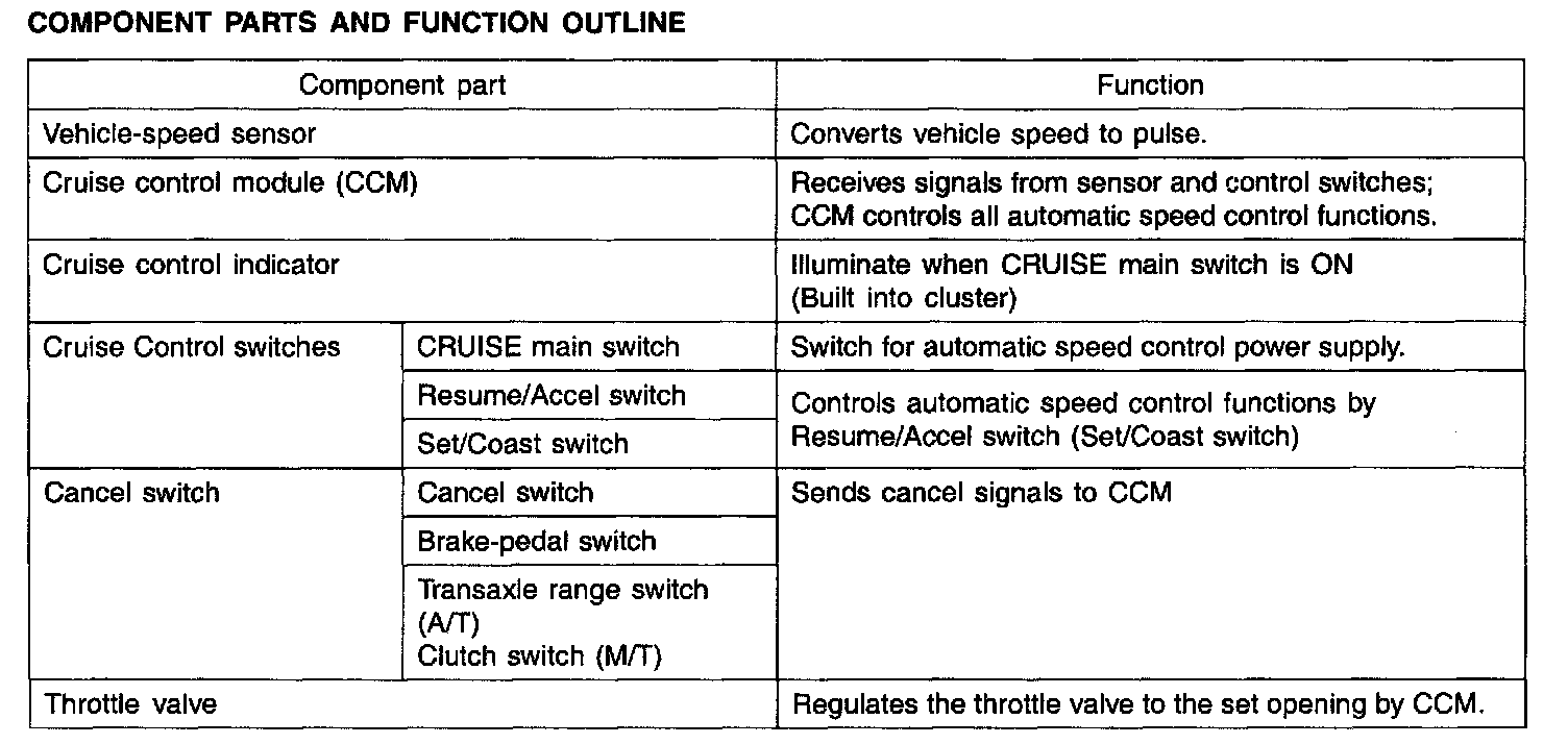 The main components of SMCC system are mode control switches, transaxle range switch, brake switch, vehicle speed sensor, cruise control module and control cable that connect throttle body.