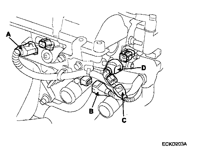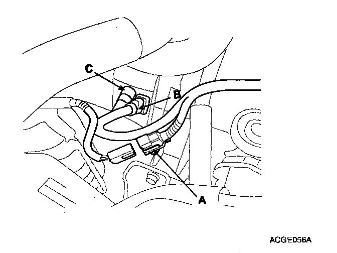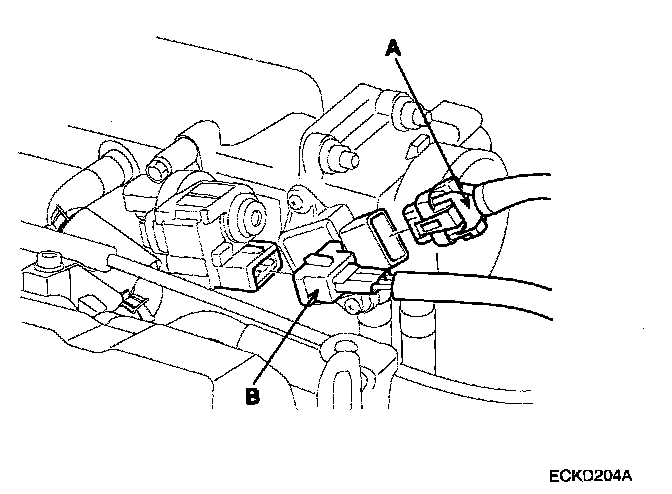 6) Disconnect the Idle Speed Actuator (ISA) connector (B).