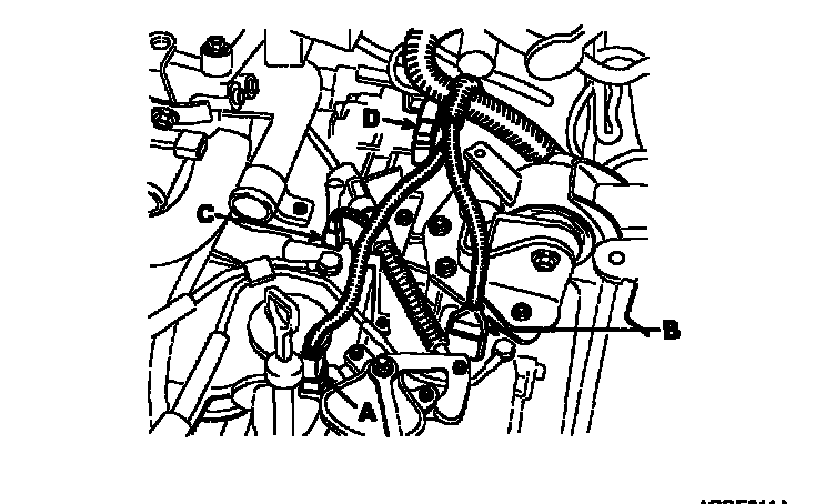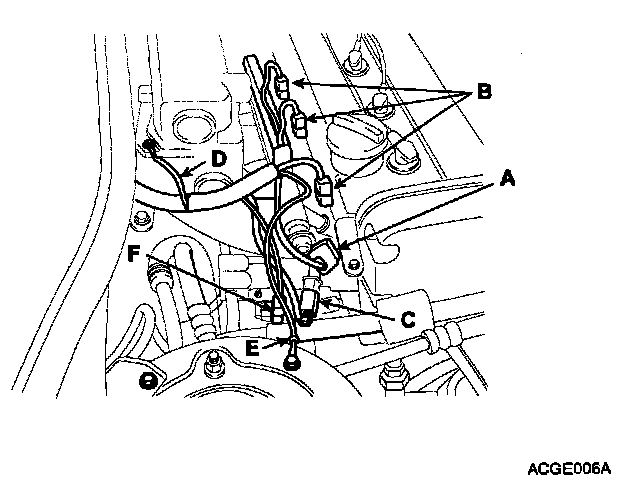 10) Disconnect the ground cables (D, E) from the intake manifold and vehicle's body.
