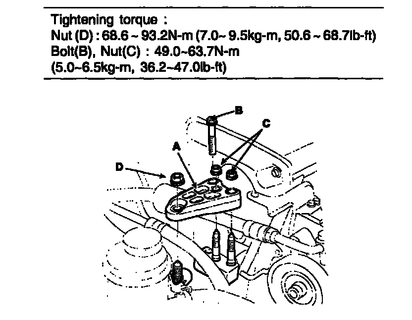 Nut (D): 68.6 - 93.2 Nm (7.0 - 9.5 kg-m, 50.6 - 68.7 ft. lbs.)