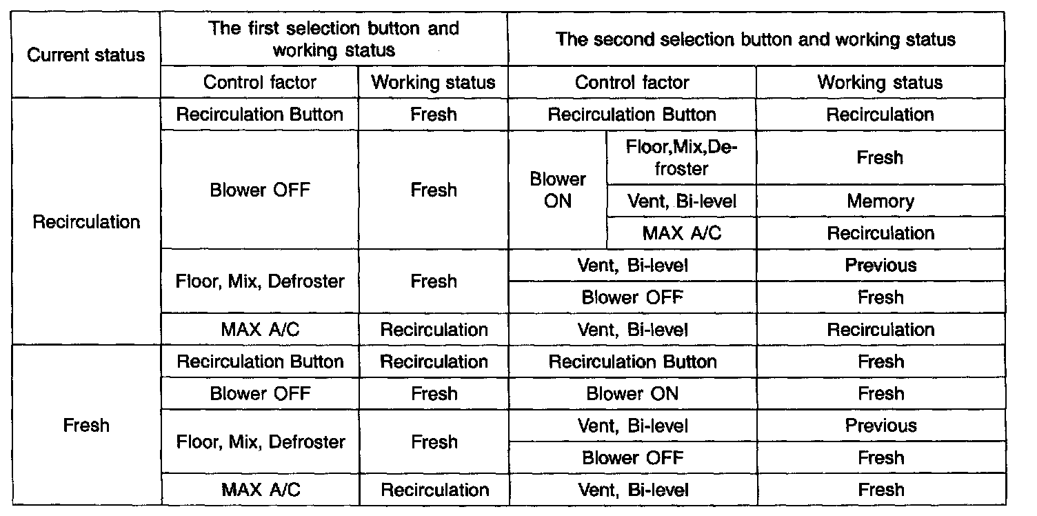 1. With battery application and IG ON, control with fresh regardless of the prior status (With MAX A/C, control with recirculation).