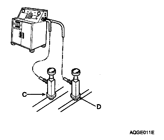 2. Connect a R-134a refrigerant Recovery/Recycling/Charging System to the high-pressure service port(D) and the low-pressure service port(C) as shown, following the equipment manufacturer's instructions.