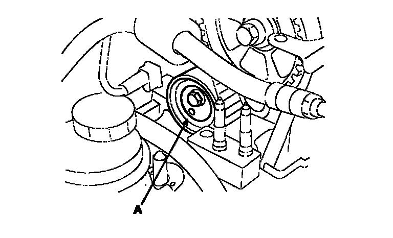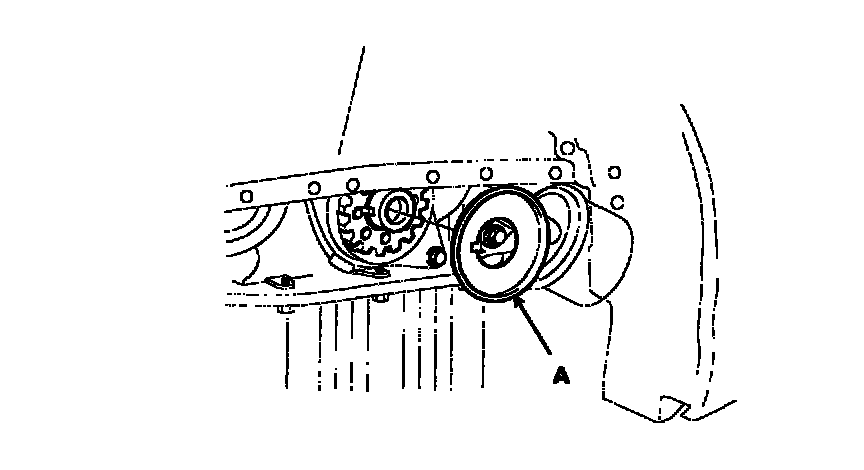 12. Install the flange and crankshaft pulley(A), and then tighten crankshaft pulley bolt(B). Make sure that the crankshaft sprocket pin fits into the small hole in the pulley.