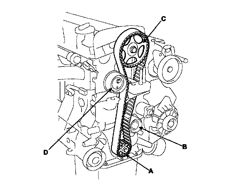Crankshaft sprocket(A) -> Idler pulley(B) -> Camshaft sprocket(C) -> Timing belt tensioner(D).