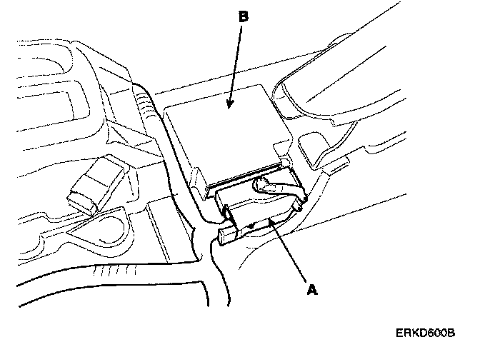 5. Disconnect the SRSCM harness connector (A) from the SRSCM (B).