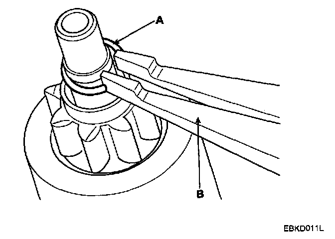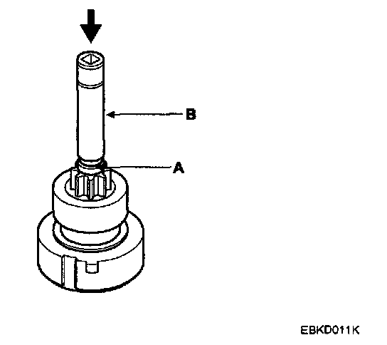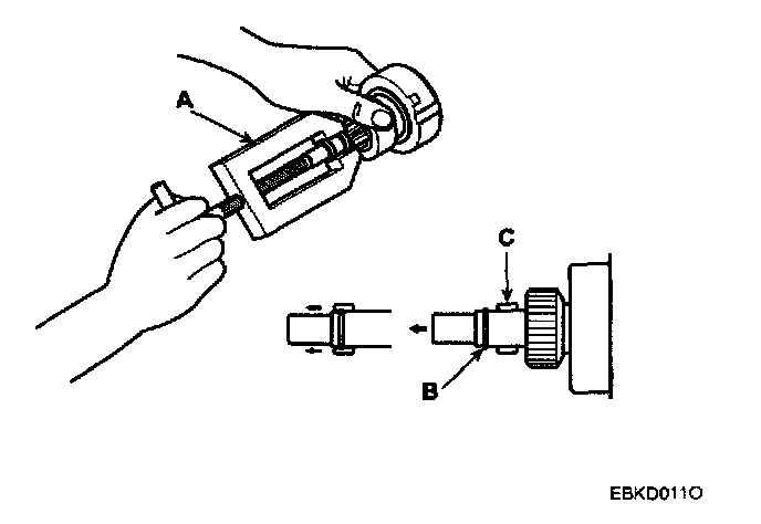 NOTE: Using a suitable pulling tool (A), pull the overrunning clutch stop ring (B) over the stopper (C).