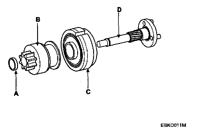 11. Disconnect the stop ring (A), overrunning clutch (B), internal gear (C) and planet shaft (D).