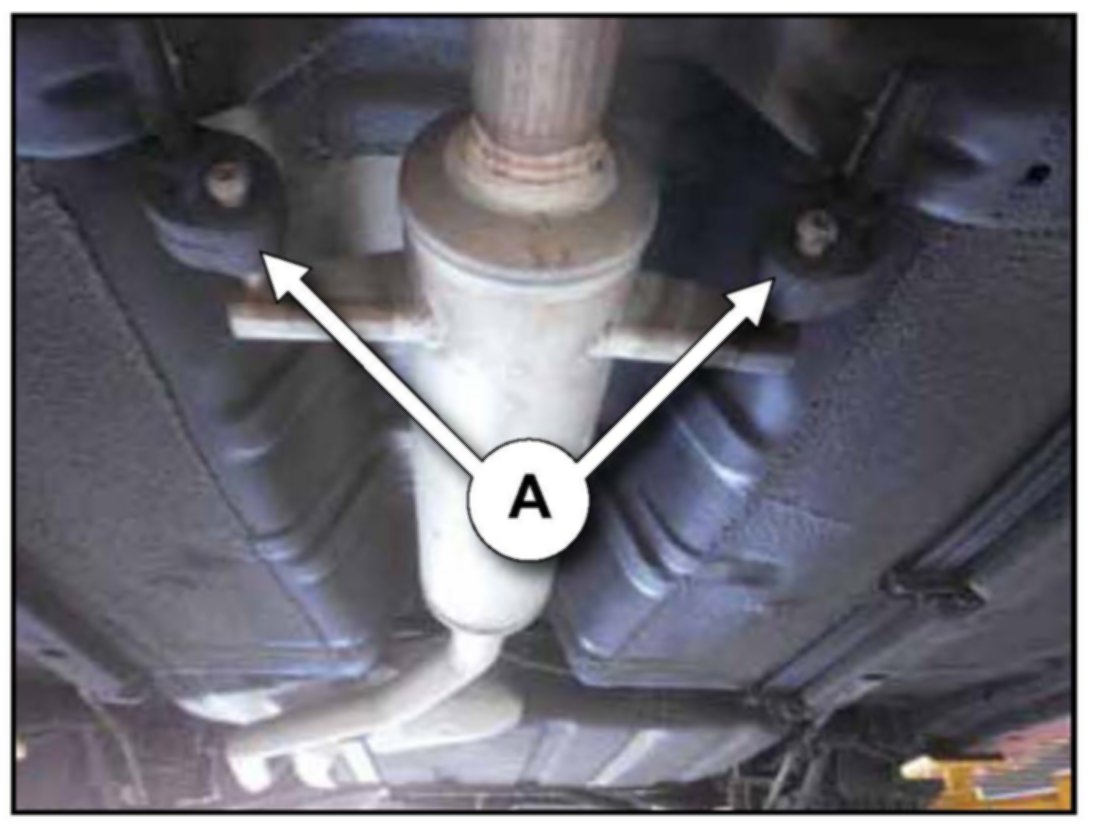 6. Remove all five (5) exhaust hangers starting with the front first (A) then the rear (C) and center (B) hangers.
