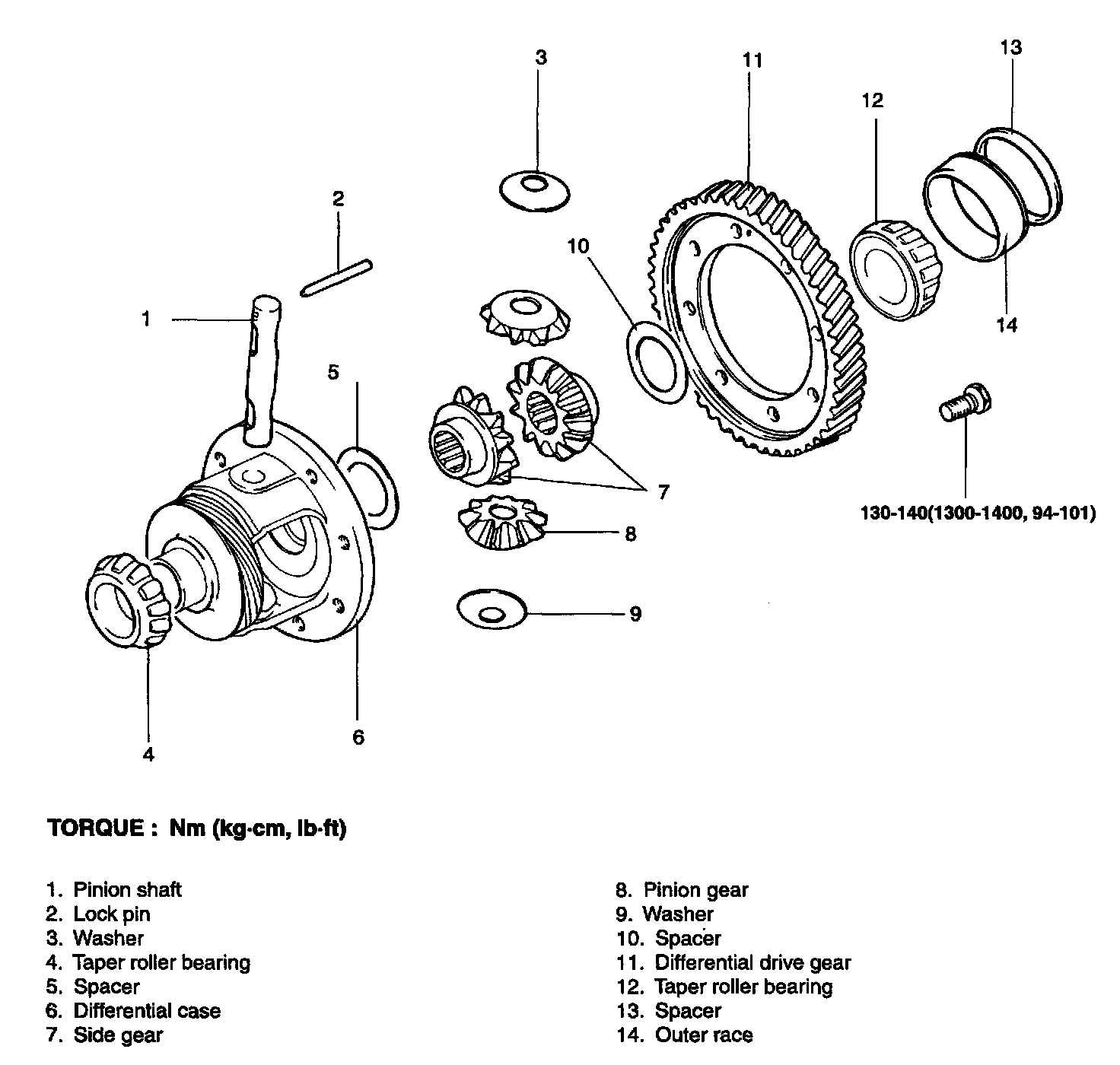 Differential drive gear bolt: 130 - 140Nm (1300 - 1400 kg-cm, 94 - 101 ft. lbs.)