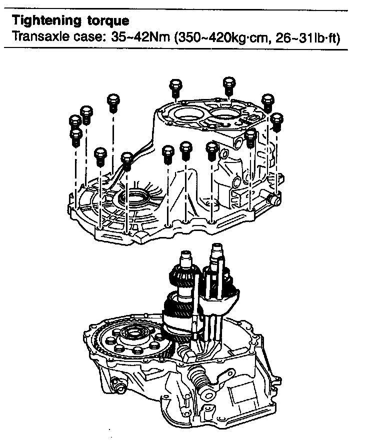 Transaxle case: 35 - 42 Nm (350 - 420 kg-cm, 26 - 31 ft. lbs.)