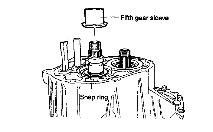 24. Install the rear bearing, spacer, snap ring and 5th gear sleeve.