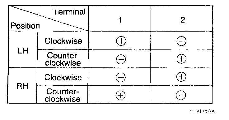 3. Connect the motor terminals directly to battery voltage (12V) and check that the motor operates smoothly. Next, reverse the polarity and check that the motor operates smoothly in the reverse direction. If the operation is abnormal, replace the motor.