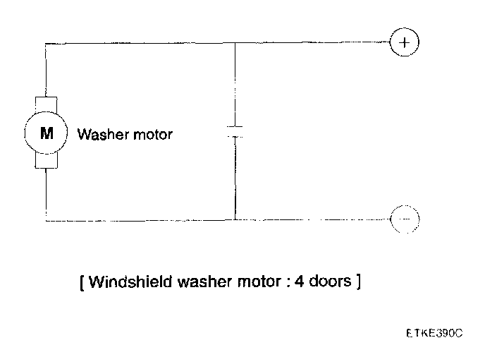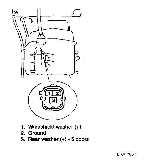 2. Connect positive (+) and negative (-) battery cables to terminals 1 and 2 respectively to see that the washer motor runs and water sprays from the front nozzles.