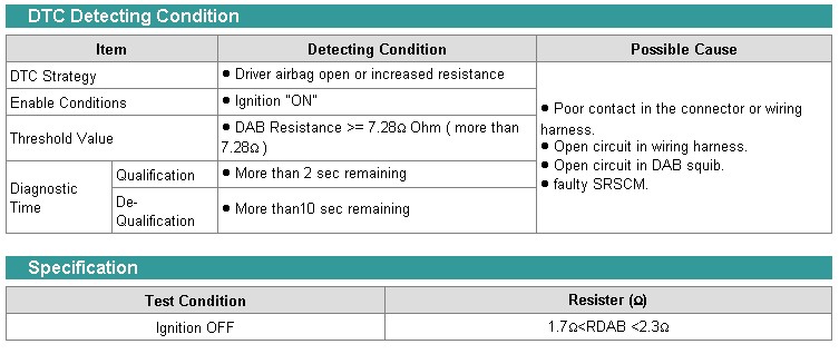 When open or increased resistance in the driver's airbag inflator occurs. When the SRS warning light remains lit and a DTC code occurs, this signifies an open circuit or an increase in resistance between control module and airbag harness.