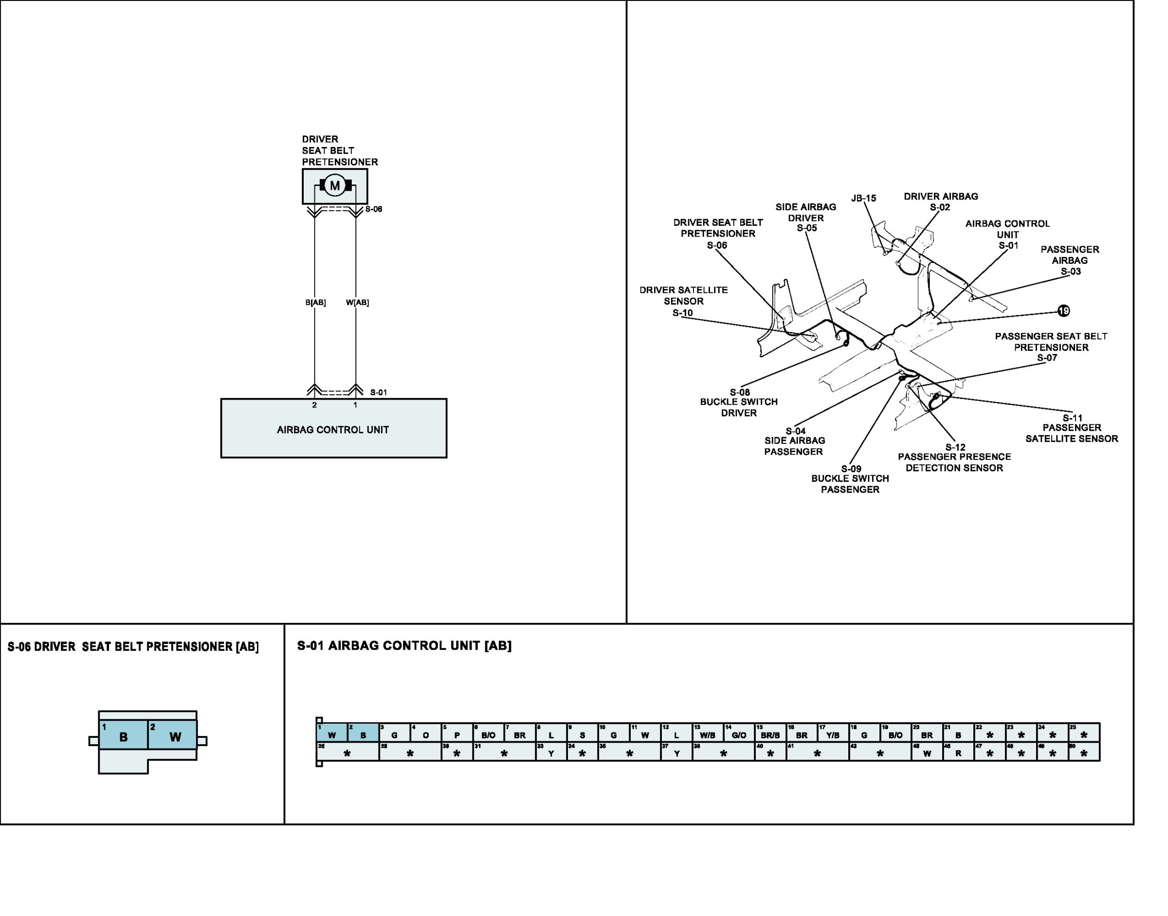When short battery circuit to the driver side pretensioner's squib occurs. When the SRS warning light remains lit and a DTC code occurs, this means a shorted battery circuit to the Pretensioner harness.