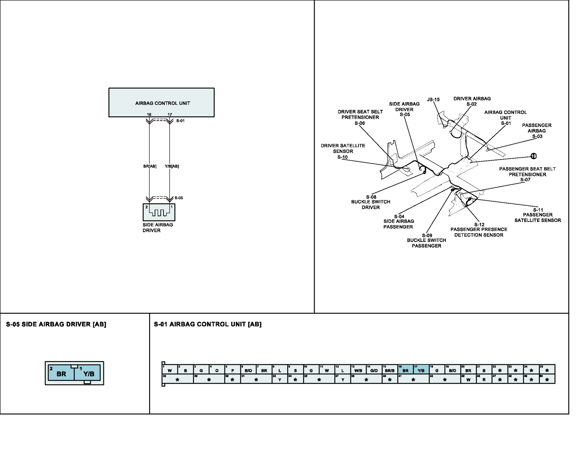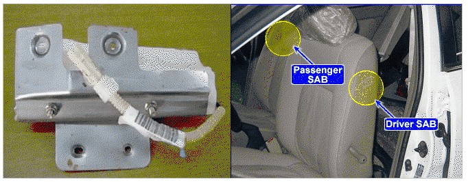 A driver side airbag (DSAB) module, located in the left side of driver's seat, contains a folded cushion together with an inflator unit (as pictured above). The firing system for the side airbag consists of a SRSCM installed in the middle of the vehicle and two satellite sensors, one on the left-hand side and one on the right. Only the SRSCM is capable of controlling the seat-belt pretensioner systems or releasing the airbags in the vehicle. The satellite sensors act as intelligent acceleration sensors, and as backups for the center airbag controller. Both satellites continuously report current system status, of the left and right-hand sides of the vehicle, to the SRSCM.