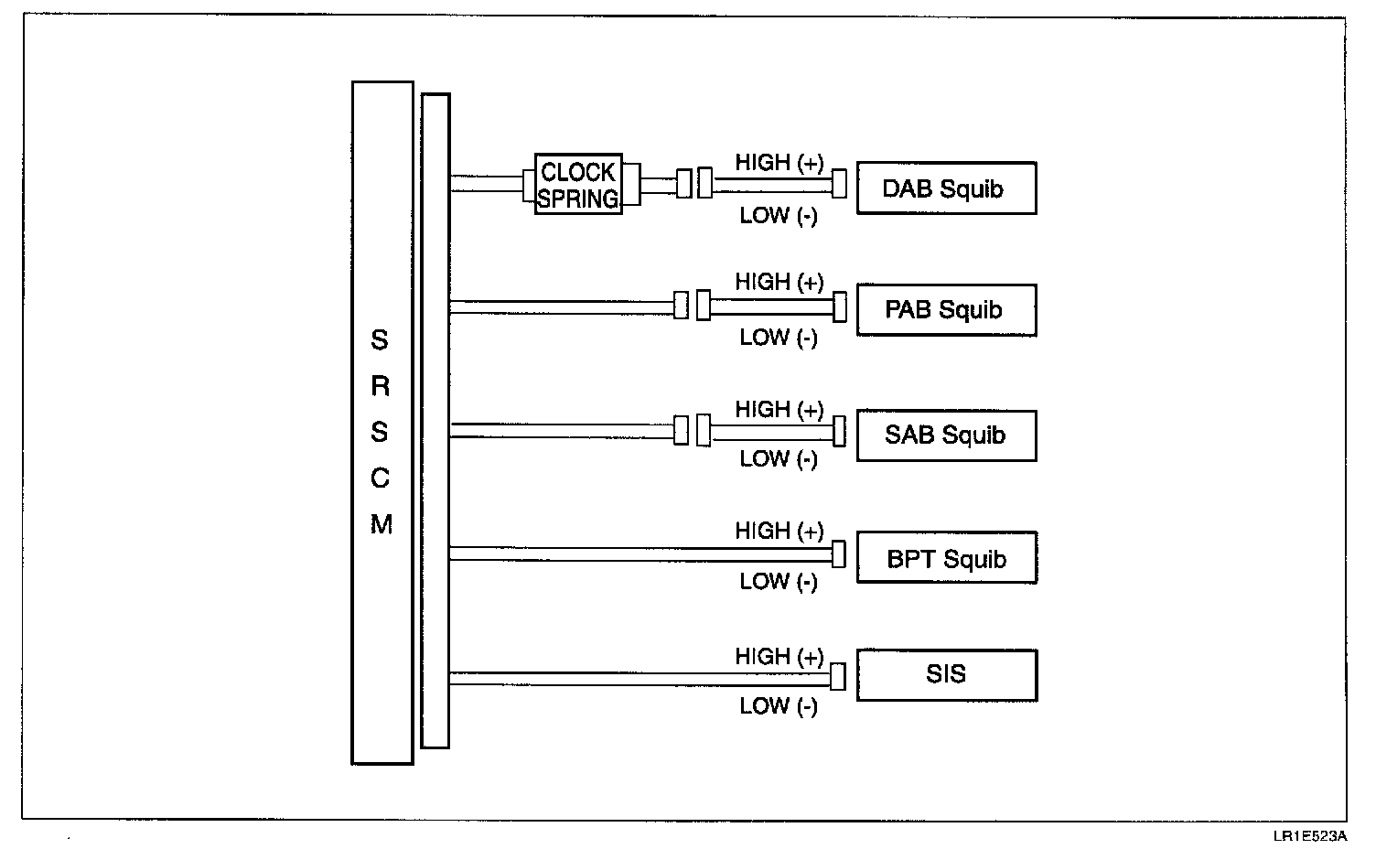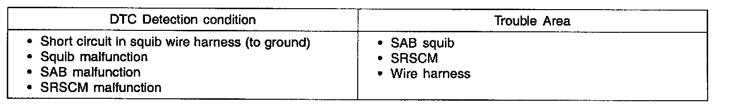 The squib circuit consists of the SRSCM, clock spring, DAB, PAB, SAB, BPT and SIS. It causes the SRS to deploy when the SRS deployment conditions are satisfied. The above DTCs are recorded when a short to ground is detected in the SAB squib circuit.