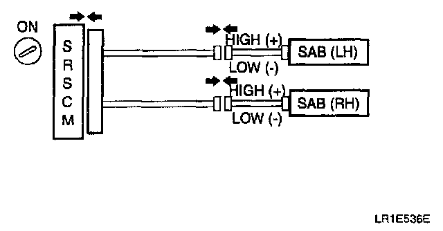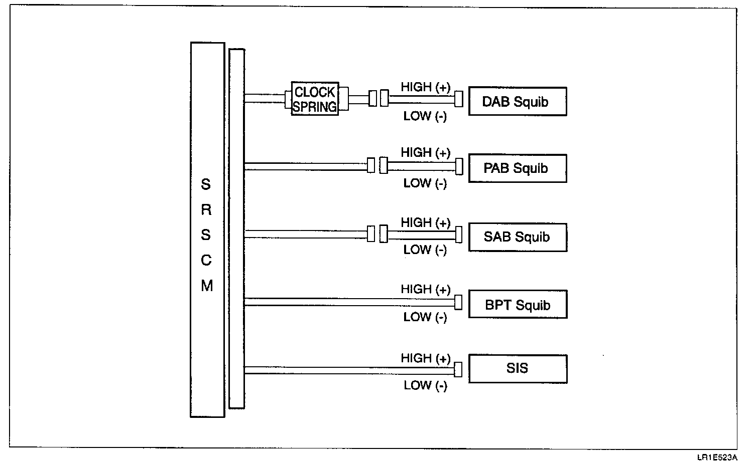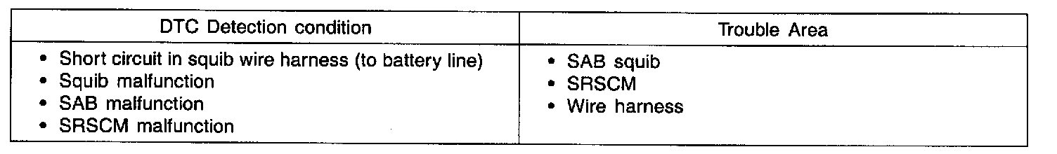 The squib circuit consists of the SRSCM, clock spring, DAB, PAB, SAB, BPT and SIS. It causes the SRS to deploy when the SRS deployment conditions are satisfied. The above DTCs are recorded when a short to battery line is detected in the SAB squib circuit.