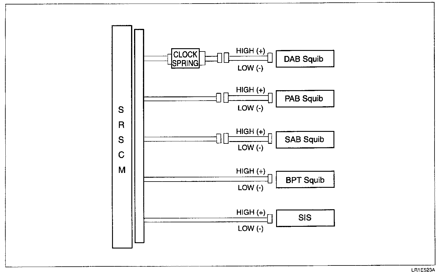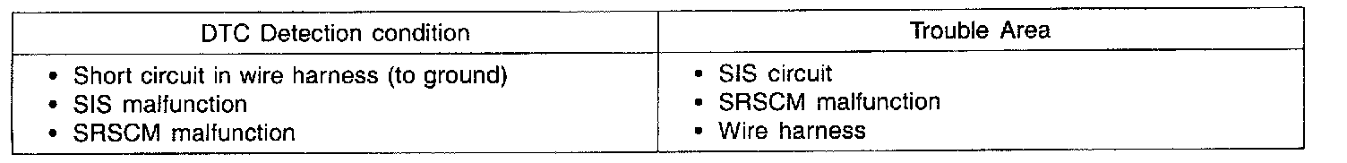The circuit consists of the SRSCM, clock spring, DAB, PAB, SAB, BPT, FIS and SIS. It causes the SRS to deploy when the SRS deployment conditions are satisfied. The above DTCs are recorded when a short to ground is detected in SIS circuit.