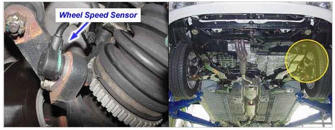The wheel speed sensor is the essential component the ABS ECU uses to calculate vehicle speed and to determine whether wheel lock occurs. For example, rear wheel speed signal is used as a referecnce value, for vehicle speed, in front wheel drive vehicles, and if a difference between front and rear wheel speed occurs, then ABS control is performed. The wheel speed sensor generates sinewave signals, based on magnetic field made by a permanent magnet in the speed sensor, when the tone wheel rotates. The frequency and AC voltage changes in proportion to the wheel speed, and the HECU determines the speed by calculating the frequeny of the signal.