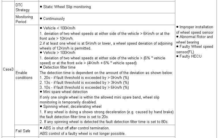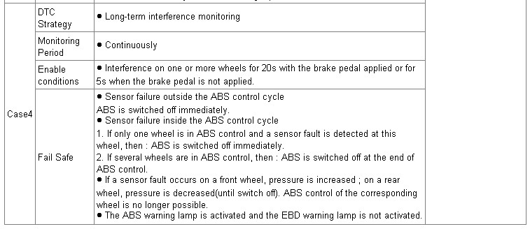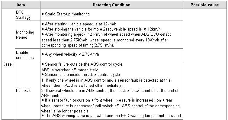 The ABS ECU monitors the wheel speed sensor signal continuously. This code is set if no wheel speed signals within 10 msec to 20 msec when the vehicle speed is more than 40 km/h or an abnormal speed change ratio is detected. Or this code is set if interference on one or more wheels for 20 sec with the brake pedal applied or for 5 sec when the brake pedal is not applied. Warning lamp is turned OFF if the detected fault is not more than when the IG KEY is turned to ON again, and wheel speeds are more than 12 Km/h.