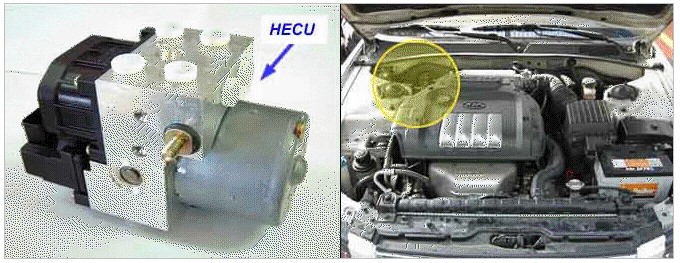 The ABS ECU supplies battery power to all solonid valves by way of a valve relay which is controlled by the Electronic Control UNIT (ECU). The valve relay and all solenoid valves are installed inside the HECU (Hydraulic and Electronic Control Unit).