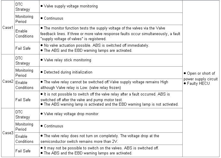 ABS ECU monitors voltage of the valve relay to check if ABS ECU can perform ABS control normally. The monitor function tests the supply voltage of the valves via the Valve feedback lines. If three or more valve response faults occur simultaneously, a fault "supply voltage of valves" is registered.