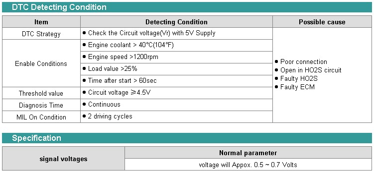 If circuit voltage is higher than 4.5V after 5V is applied to the HO2S output line via a resistor, the ECM determines that a fault exists and a DTC is stored.