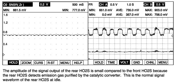 The rear heated oxygen sensor is mounted on the rear side of the Catalytic Converter (warm-up catalytic converter) or in the rear exhaust pipe, which detects the catalyst efficiency. The rear heated oxygen sensor (HO2S) produces a voltage between 0V and 1V. This rear heated oxygen sensor is used to estimate the oxygen storage capability. If a catalyst has good conversion properties, the oxygen fluctuations are smoothed by the oxygen storage capacity of the catalyst. If the conversion provided by the catalyst is low due to aging, poisoning or misfiring, then the oxygen fluctuations are similar to signals from the front oxygen sensor.