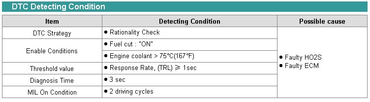 If the rear HO2S signal's reponse time from rich to lean is longer than 1 second while engine is in fuel cut-off and Engine coolant temperature is over 82°C (179.6°F) , the ECM determines that a fault exists and a DTC is stored.