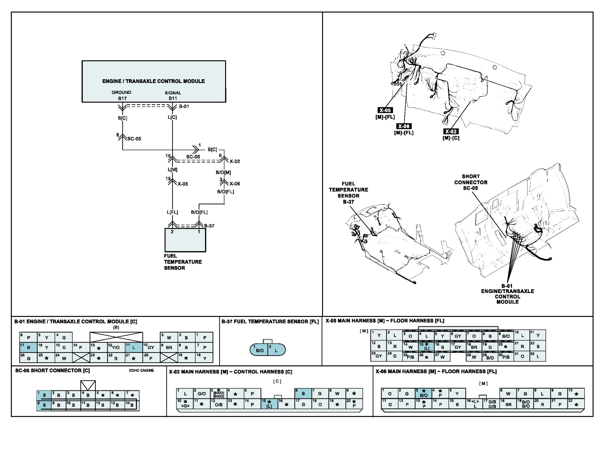The fuel temperature sensor is located in the fuel tank for detecting the fuel tnak temperature. The fuel temperature sensor uses a thermistor whose resistance changes with the temperature. The electrical resistance of the fuel temperature sensor decreases as the temperature increases, and increases as the temperature decreases.