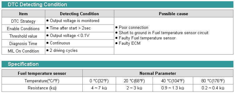 If fuel temperature sensor��s signal is less than 0.1V after starting, the ECM determines that a fault exists and a DTC is stored.