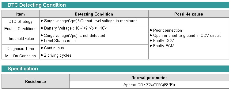 If the surge & output voltage is satisfied with threshold value, the ECM determines that a fault exists and a DTC is stored.