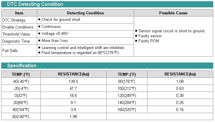 The automatic TRANSAXLE fluid (ATF) temperature sensor is installed in the Valve Body. This sensor uses a thermistor whose resistance changes according to the temperature changes. The TCM supplies a 5V reference voltage to the sensor, and the output voltage of the sensor changes when the ATF temperature varies. The automatic TRANSAXLE fluid (ATF) temperature provides very important data for the TCM's control of the Torque Converter Clutch, and is also used for many other purposes.