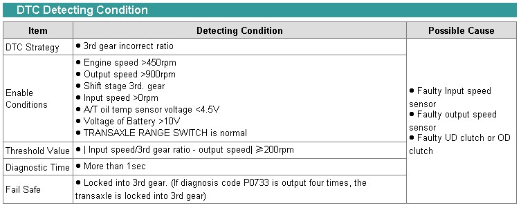 This code is set if the value of input shaft speed is not equal to the value of the output shaft, when multiplied by the 3rd gear ratio, while the transaxle is engaged in 3rd gear. This malfunction is mainly caused by mechanical troubles such as control valve sticking or solenoid valve malfuctioning rather than an electrical issue.