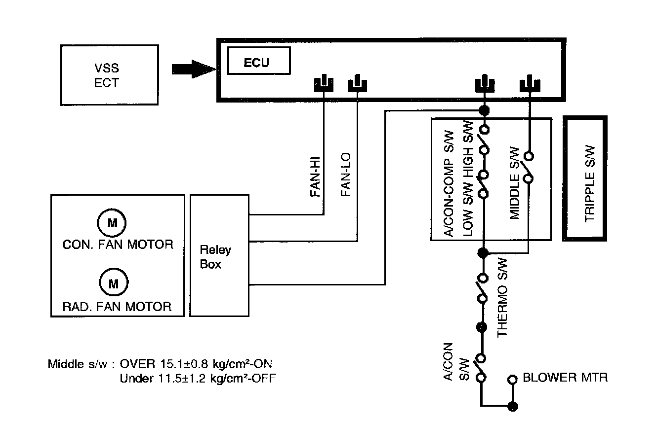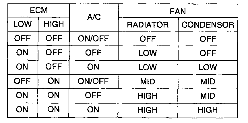ECM controls the cooling fan in 3 steps (LO/MIDDLE/HI) according to the vehicle speed, the air-conditioning load and engine coolant temperature.