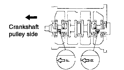 After installing the bearing caps, make sure that the crankshaft turns smoothly and the end play is correct. If the end play exceeds the limit, replace crankshaft bearings.