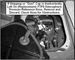 The ECM/PCM uses the FTPS signal to verify proper CCV venting operation and to determine whether a leak is present in the EVAP system. The sensor provides actual tank pressure information during the test mode by comparing the pressure inside the tank to the atmospheric pressure. Because the FTPS is a differential pressure type sensor, make sure the atmospheric reference hose or port is never blocked, capped (see photo) or kinked as this may intermittently cause an EVAP related malfunction such as identified by a canister close valve/vent malfunction DTC.