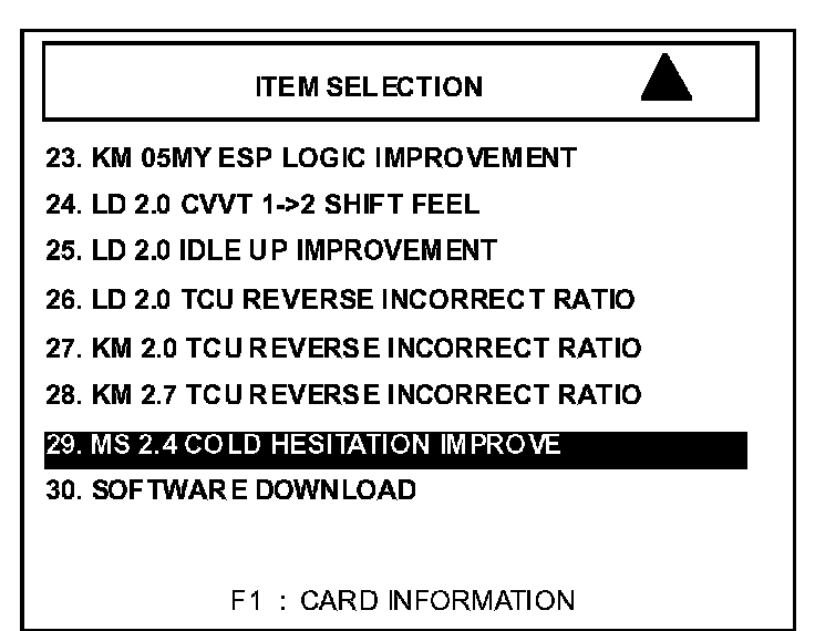 Use the 32MB blue reprogramming card that was sent to your dealer October 2004. Download the latest Hi-Scan Pro reprogramming software for the 32MB (blue label) reprogramming card from the Kia Service Information System (KSIS). The "Downloads" page is accessed by first logging onto KSIS, then by clicking on the "Downloads" link located in KSIS News Center. Dealers can also order a CD (optional) by calling 866 KIA-TOOLS and ordering P/N 111321KM.